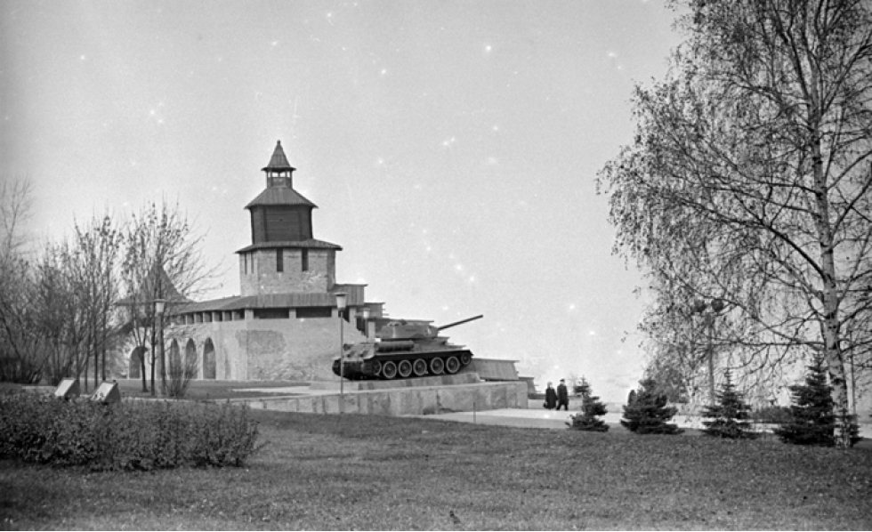 Постоянно действующая выставка техники, выпускавшейся в г.Горьком в годы Великой Отечественной войны, на территории Нижегородского кремля; вид Дмитриевской башни кремля
