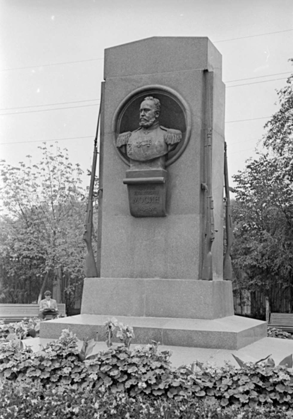 Вид памятника — барельефа конструктору стрелкового оружия С.И. Мосину (1958, скульп. В.Мухина, арх.Заварзин) у стен Тульского оружейного завода