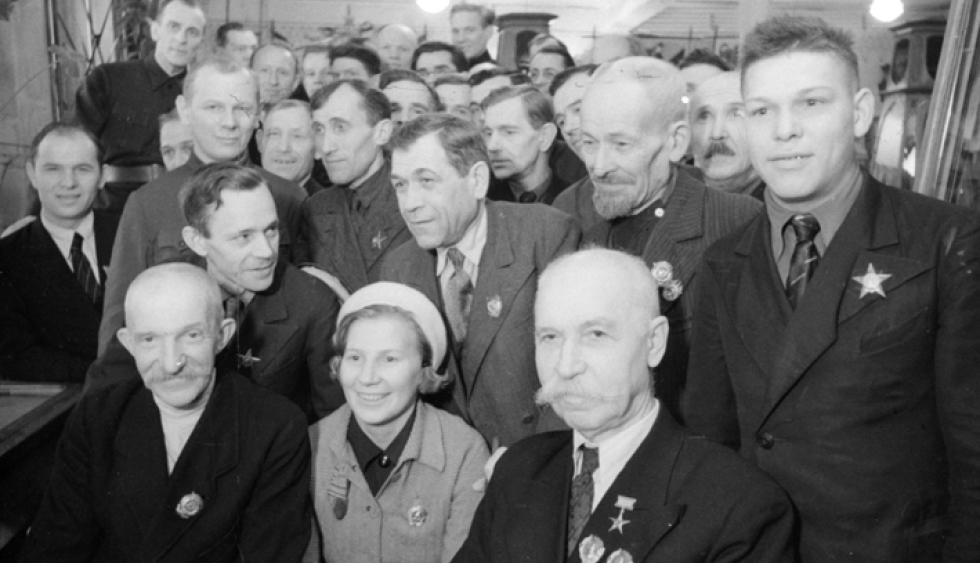 Доктор технических наук, автор различных типов стрелкового оружия, Герой Социалистического Труда, лауреат Сталинской премии первой степени Ф.В.Токарев (сидит первый справа) среди рабочих-орденоносцев Тульского оружейного завода