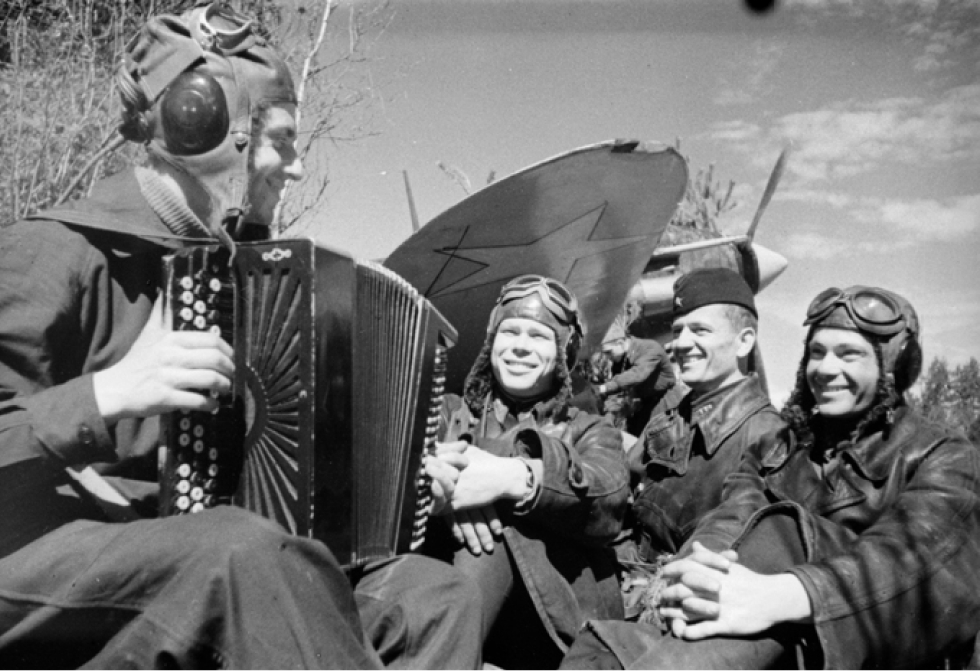Бойцы авиационной части, в свободное от боев время, слушают игру товарища на баяне