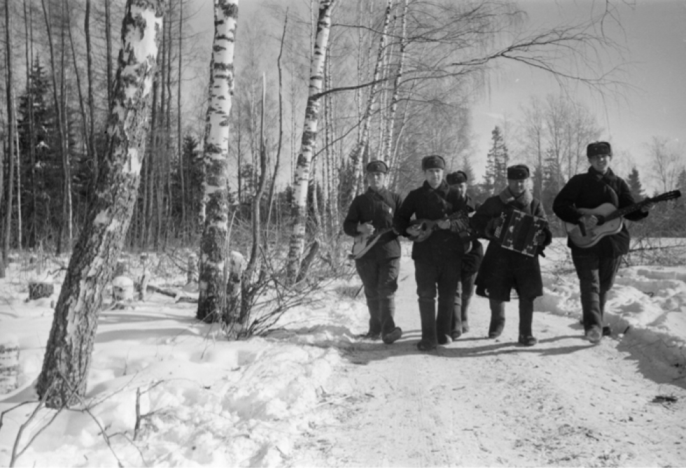 Красноармейцы идут по лесной дороге, играя на балалайках, гитаре, гармони