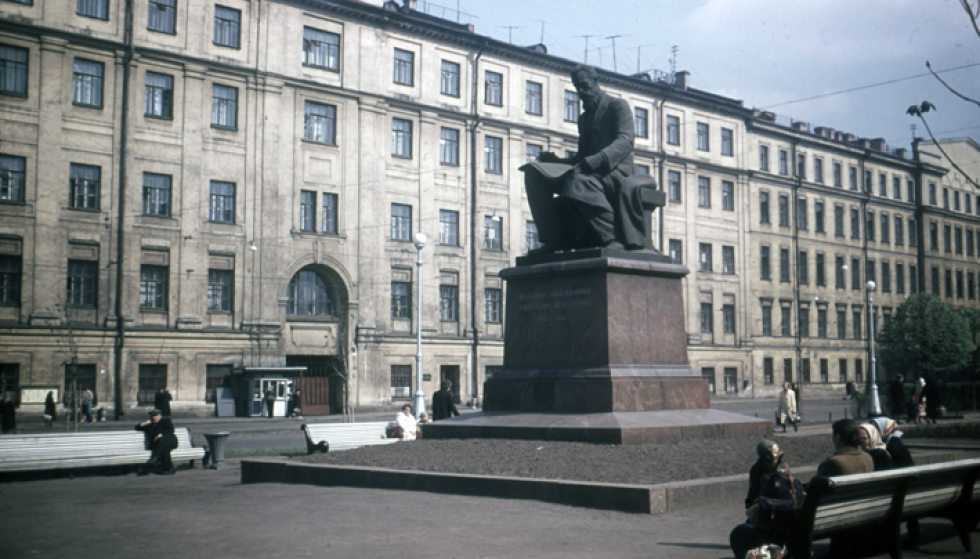 Общий вид памятника русскому композитору Н.А. Римскому-Корсакову (1952, архитектор М.А. Шепилевский, скульпторы В.Я. Боголюбов, В.И. Ингал) на Театральной площади у здания Ленинградской консерватории