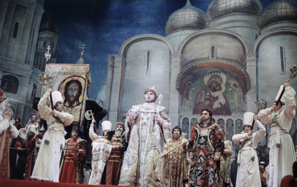 Народный артист СССР А.Огнивцев (Борис Годунов) в сцене из оперы М.Мусоргского "Борис Годунов" в постановке Большого театра СССР