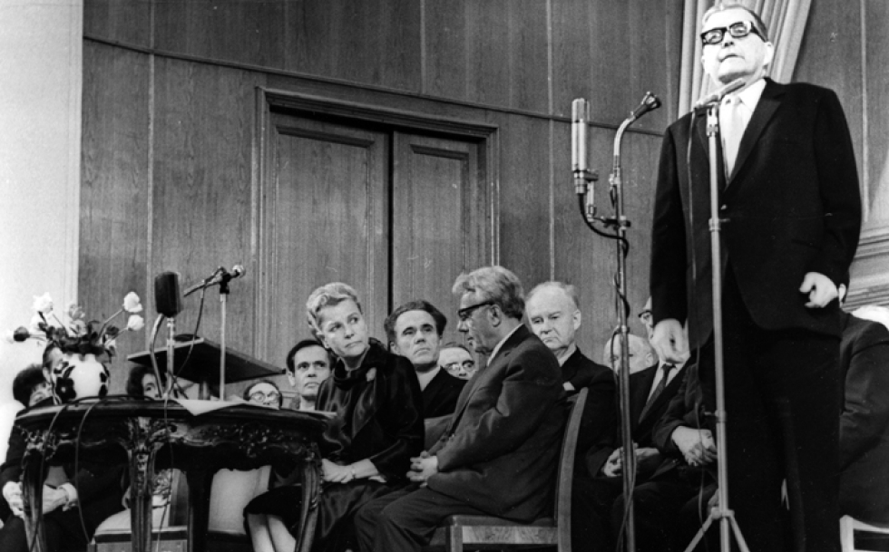 Посещение министром культуры СССР Е.А. Фурцевой концерта И.Ф. Стравинского в Большом зале Московской консерватории. Е.А. Фурцева, В.А. Стравинская, народный артист СССР, композитор Ю.А. Шапорин и дирижер И.Ф. Стравинский во время беседы в антракте