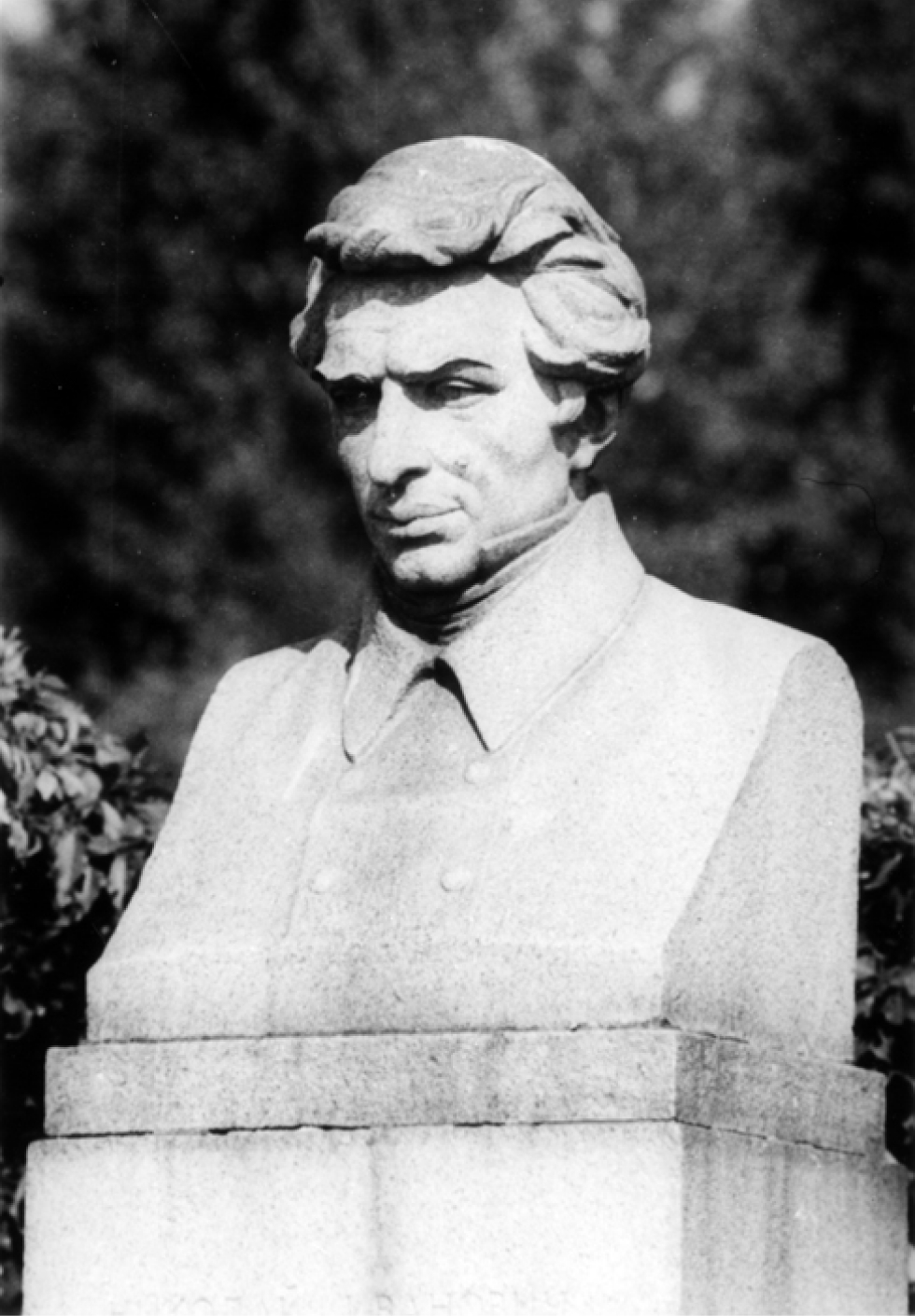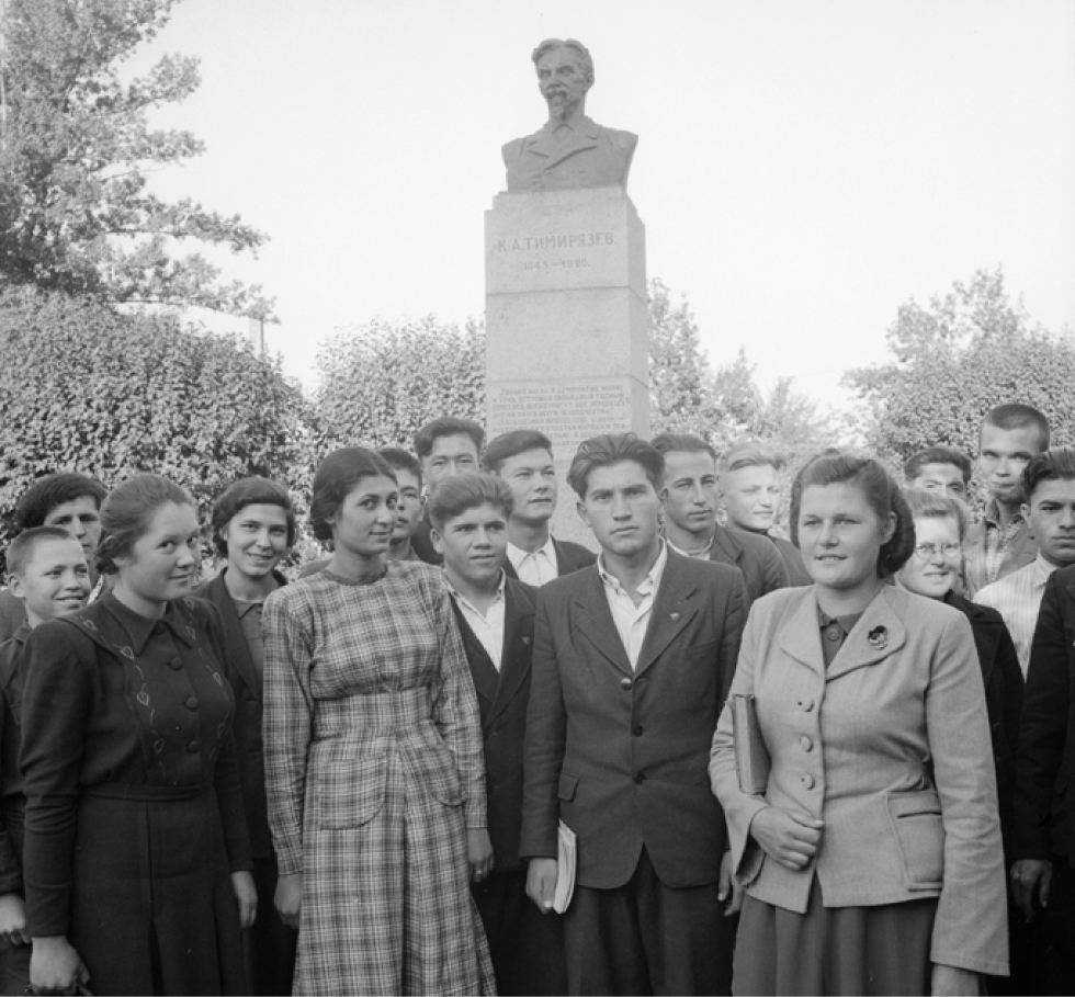 Студенты Московской сельскохозяйственной академии имени К.А.Тимирязева в парке академии у памятника-бюста учёному-естествоиспытателю К.А.Тимирязеву (1924, арх. С.Г.Чернышёв, скульп. М.М.Страховская).